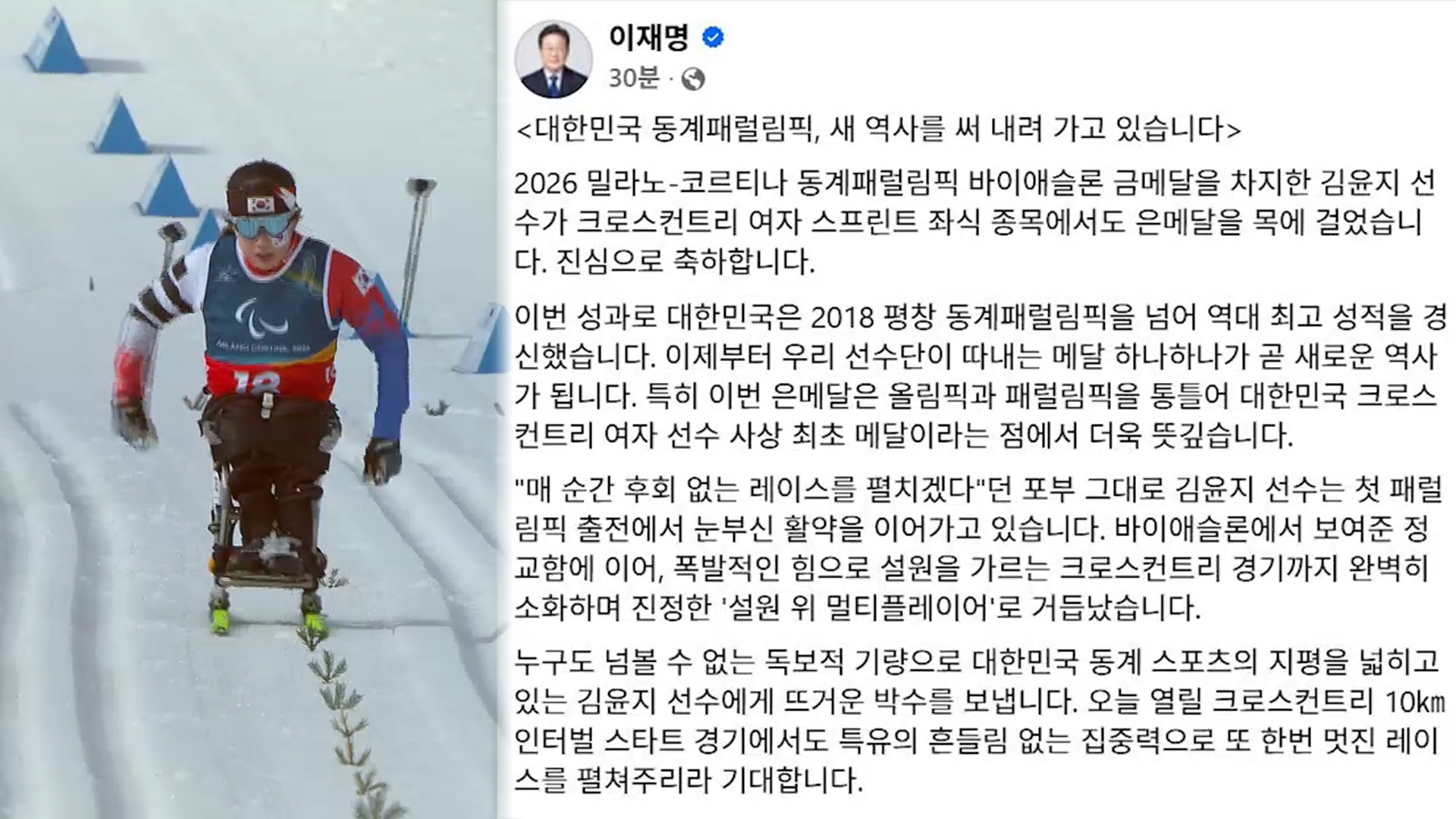 이재명 대통령이 "2026 밀라노-코르티나 동계패럴림픽 바이애슬론 금메달을 차지한 김윤지 선수가 크로스컨트리 여자 스프린트 좌식 종목에서도 은메달을 목에 걸었다"며 축하 메시지를 전했습니다.