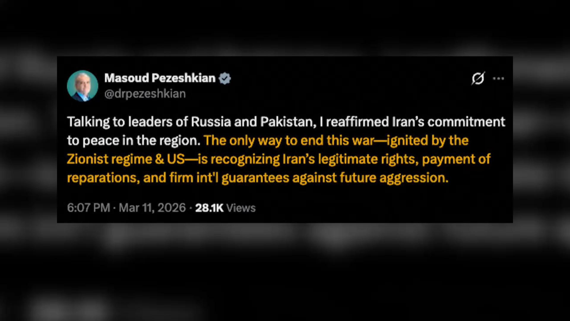 마수드 페제시키안 이란 대통령은 미국·이스라엘과의 전쟁을 끝내기 위한 조건으로 침략 재발 방지 보장을 제시했습니다.