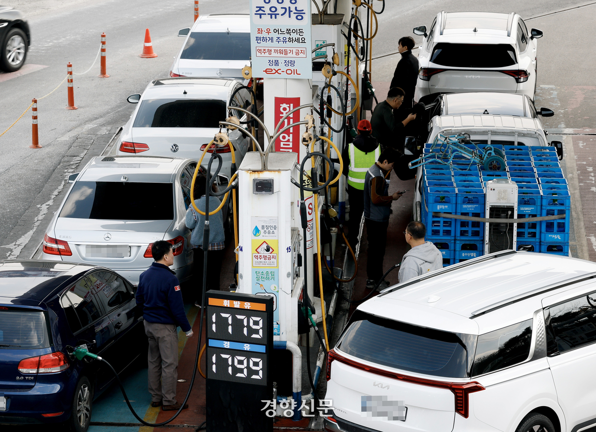 미국과 이란의 전쟁으로 중동 정세가 악화되면서 국제 유가가 치솟고 있는 가운데 지난 9일 서울 서초구 만남의광장(부산방면) 휴게소 주유소에서 시중보다 싼 기름을 넣으려는 차량들이 줄지어 서 있다. 문재원 기자 |