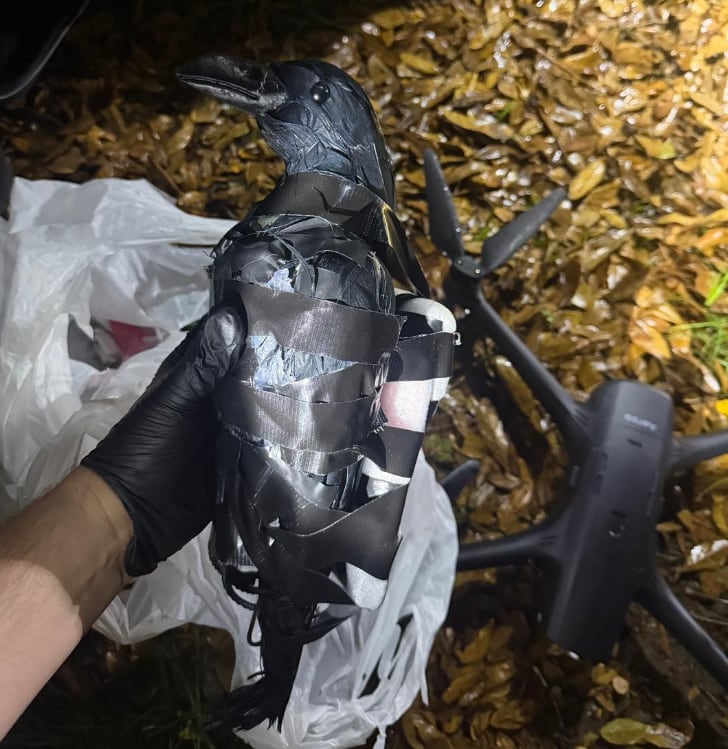까마귀 모형 속에는 담배와 마약, 휴대전화 등 반입 금지 물품이 들어있었다. 보안관실이 공개한 모형 사진을 보면 까만 새 모형에 무언가를 검은 테이프로 칭칭 감아 부착해둔 모습이다.