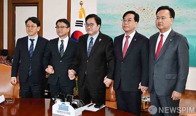 [서울=뉴스핌] 윤창빈 기자 = 우원식 국회의장과 여야 원내대표 및 원내수석이 12일 오전 서울 여의도 국회에서 열린 여야 원내대표 회동에서 기념촬영을 하고 있다. 왼쪽부터 천준호 더불어민주당 원내운영수석부대표, 한병도 더불어민주당 원내대표, 우 의장, 송언석 국민의힘 원내대표, 유상범 국민의힘 원내수석부대표. 2026.03.12 pangbin@newspim.com