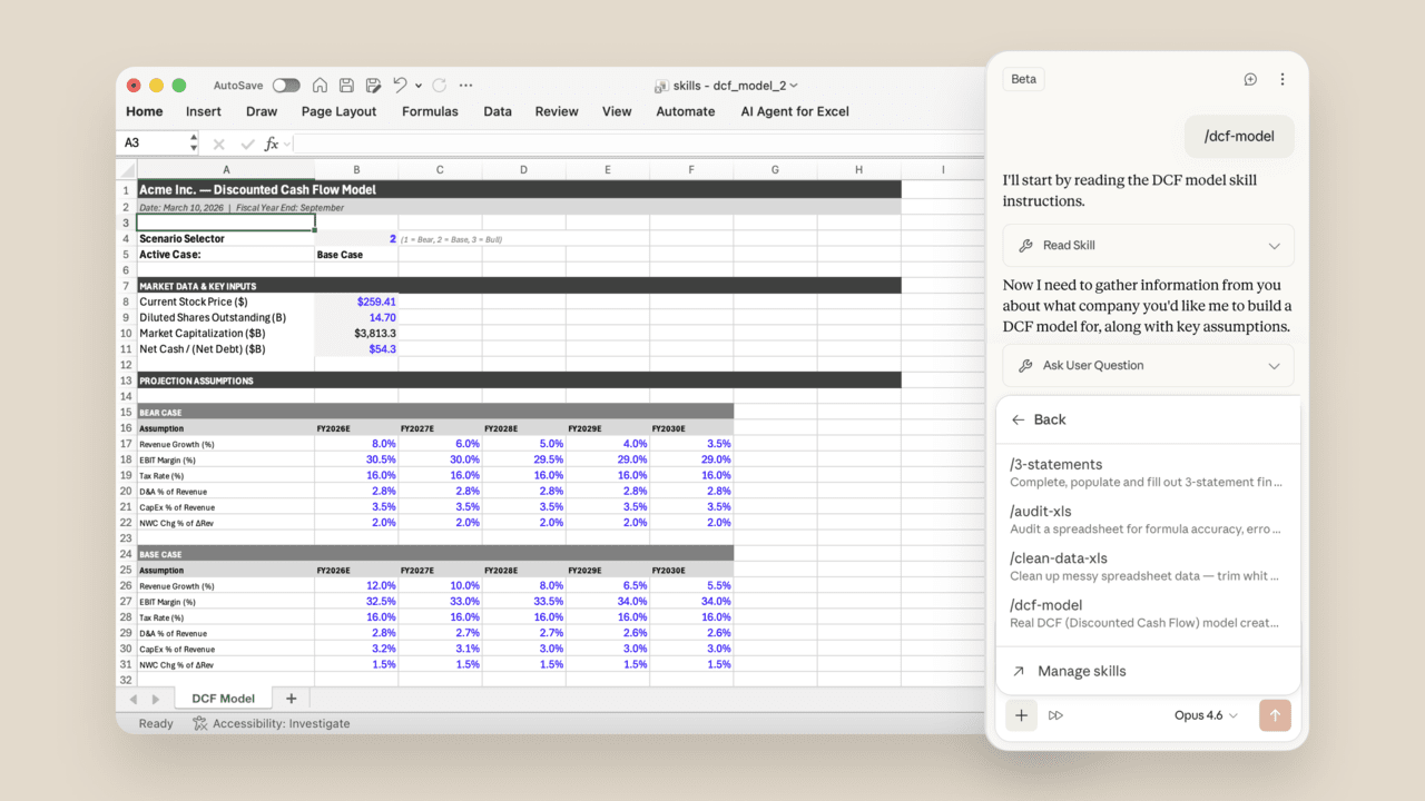 예를 들어, 엑셀에서는 수식 오류를 점검하고 DCF(현금흐름할인법)·LBO(차입매수) 모델 템플릿을 작성하거나 데이터를 정리하는 작업을 스킬로 지정할 수 있다. 파워포인트에서는 경쟁 환경 분석을 위한 프레젠테이션을 제작하고 투자은행 관련 자료를 검토하는 작업도 가능하다.