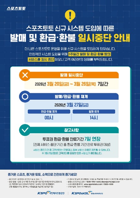 [더팩트 | 박순규 기자] 서울올림픽기념국민체육진흥공단이 발행하는 체육진흥투표권(스포츠토토)의 수탁사업자 한국스포츠레저(주)가 신규 시스템 도입을 위해, 2026년 3월 20일(금) 00시부터 3월 26일(목) 24시까지 7일간 발매 및 환급·환불 서비스를 일시 중단한다.