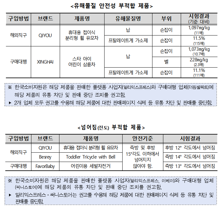 이와 함께 구매대행 방식으로 판매된 4개 제품은 KC 안전확인 신고 없이 판매돼 ‘어린이제품 안전 특별법’을 위반한 것으로 확인됐다. 해당 제품은 FavorBaby, XINGHAI, Lecoco, maidou 등이다.