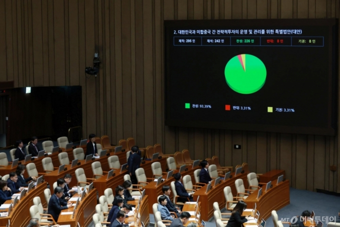 대미투자특별법은 이날 서울 여의도 국회에서 열린 본회의에서 재석 242인 중 226명 찬성으로 가결됐다. 반대 8명, 기권 8명 등이었다. 법안은 지난해 11월 한미 양국이 총 3500억 달러(한화 약 518조원) 규모의 투자를 시행한다는 내용의 업무협약(MOU)에 따라 한미전략투자공사를 신설하고 한미전략투자기금을 설치하는 내용이 골자다.