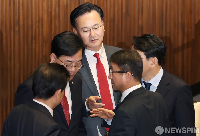 [서울=뉴스핌] 정일구 기자 = 한병도 더불어민주당 원내대표와 송언석 국민의힘 원내대표가 12일 오후 서울 여의도 국회에서 열린 본회의에서 대화를 나누고 있다. 2026.03.12 mironj19@newspim.com |