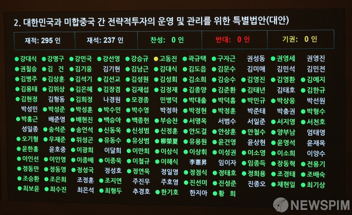 [서울=뉴스핌] 정일구 기자 = 12일 오후 서울 여의도 국회에서 열린 본회의에서 대한민국과 미합중국 간 전략적투자의 운영 및 관리를 위한 특별법안(대안)이 가결되고 있다. 2026.03.12 mironj19@newspim.com