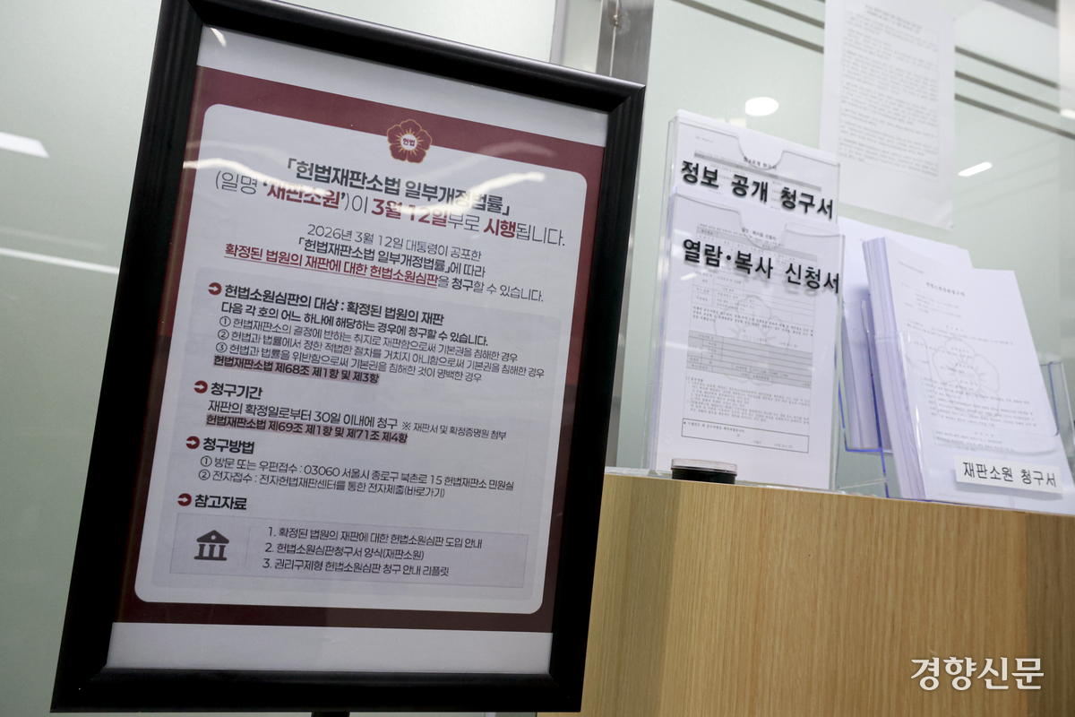 ‘최종심’인 대법원의 판결을 헌법재판소에서 다툴 수 있는 내용을 포함한 재판소원법이 공포·시행된 12일 서울 종로구 헌법재판소 민원실에 관련 안내문이 게시돼 있다. 문재원 기자 |