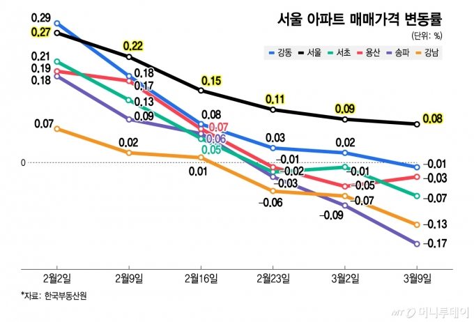 12일 한국부동산원이 발표한 '3월 둘째 주(9일 기준) 주간 아파트 가격 동향'에 따르면 서울 아파트 매매가격은 전주 대비 0.08% 상승했다. 전주(0.09% 상승)에 비해 상승 폭은 다소 축소됐다. 서울 아파트 매매가 상승률은 지난달 첫째 주(2일 기준)부터 6주 연속 둔화하는 모습이다.
