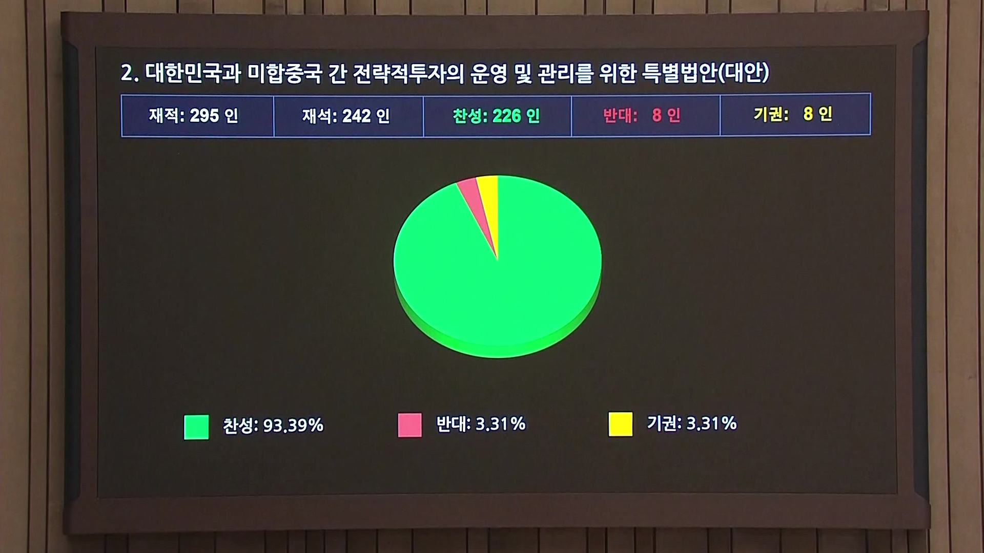 <우원식 / 국회의장> "찬성 226인, 반대 8인, 기권 8인으로써…가결되었음을 선포합니다."