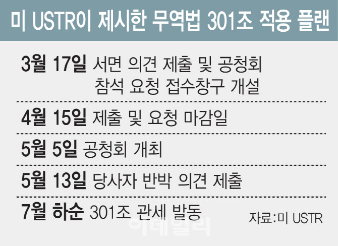 USTR은 오는 3월 17일부터 4월 15일까지 이해관계자의 서면 의견을 접수하고 5월 5일 공청회를 열 예정이다. 조사 결과에 따라 이르면 7월께 관세 조치가 나올 가능성도 제기된다. 통상 한 국가에 대한 301조 관세 적용을 위한 조사에만 최소 수개월이 필요하지만 이번엔 16개 경제주체에 대한 대대적 동시 조사를 5개월 안에 끝내고 이를 상호관세의 완전한 대체 수단으로 쓰겠다는 의미다.