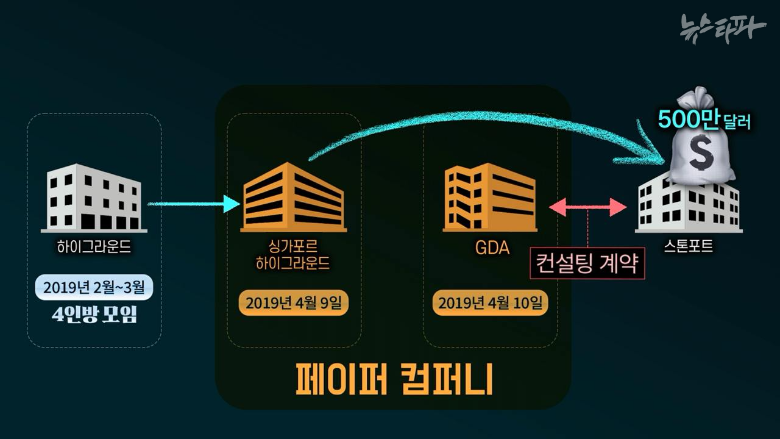 하이그라운드는 자금 송금 과정에서 스톤포트로 투자금을 직접 보내지 않고, 자금 흐름 사이에 회사 두 개를 끼워 넣는다.