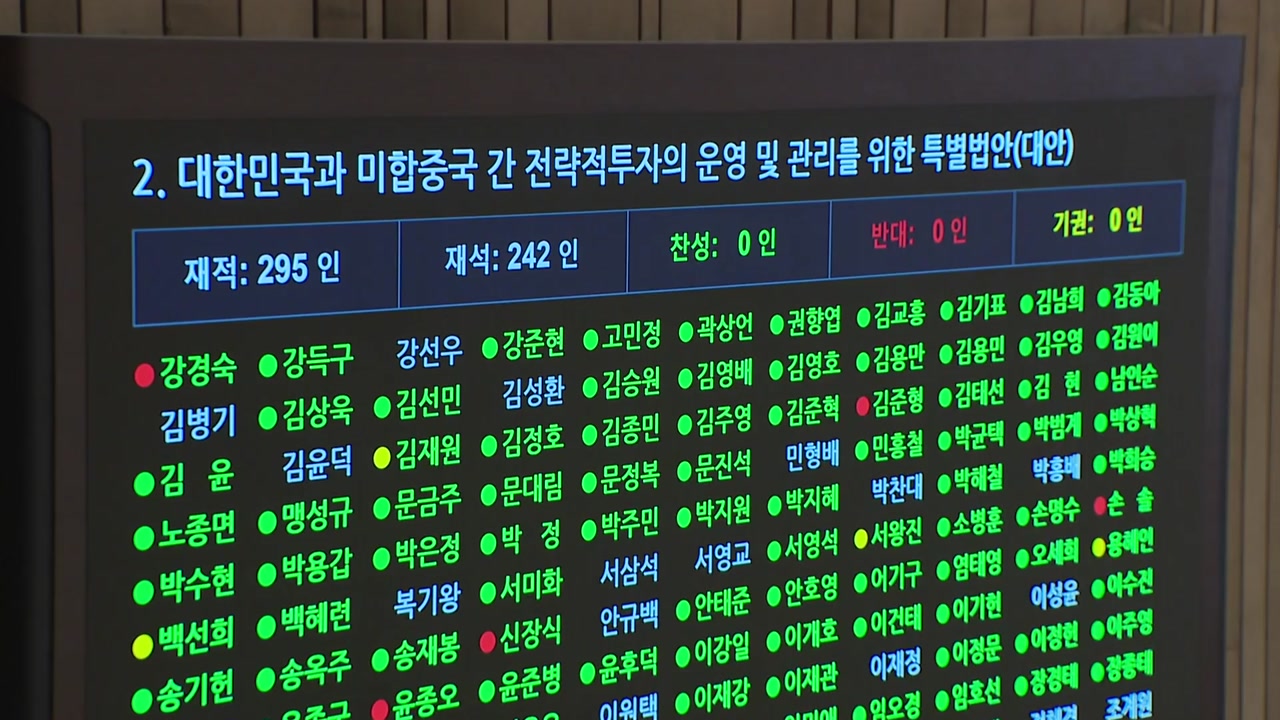 국회는 오늘(12일) 본회의를 열어 재석 의원 242명 가운데 찬성 226명, 반대 8명, 기권 8명으로 대미투자특별법을 가결 처리했습니다.