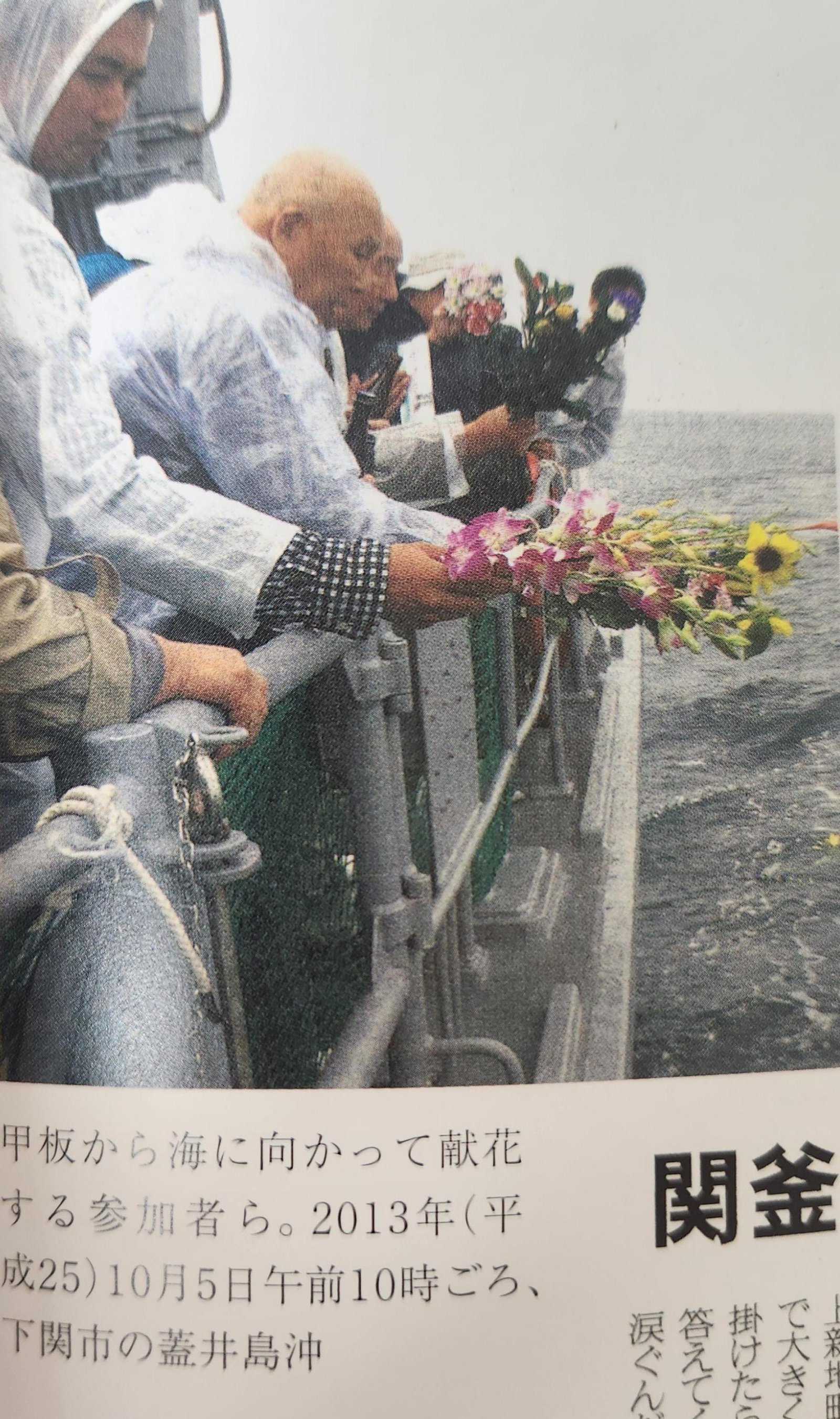 2013년 10월 5일 일본 야마구치현 시모노세키시 인근 해상에서 열린 곤론마루 침몰 희생자를 위한 추모 행사에 참여한 유족들이 선박 갑판에서 바다를 향해 헌화하고 있다. 관문해협도선사(関門海峡渡船史) 서적 캡처 |
