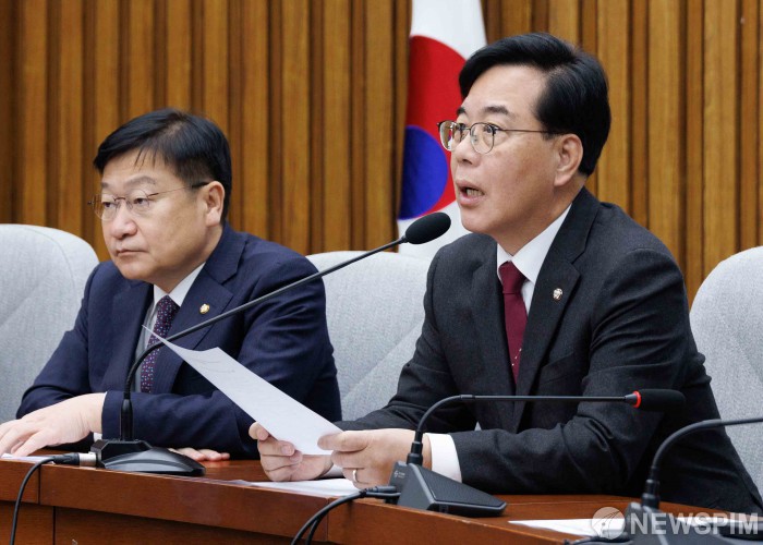 [서울=뉴스핌] 윤창빈 기자 = 송언석 국민의힘 원내대표가 13일 오전 서울 여의도 국회에서 열린 원내대책회의에서 모두발언을 하고 있다. 2026.03.13 pangbin@newspim.com