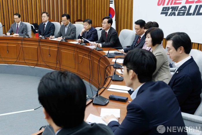 [서울=뉴스핌] 윤창빈 기자 = 송언석 국민의힘 원내대표가 13일 오전 서울 여의도 국회에서 열린 원내대책회의에서 모두발언을 하고 있다. 2026.03.13 pangbin@newspim.com