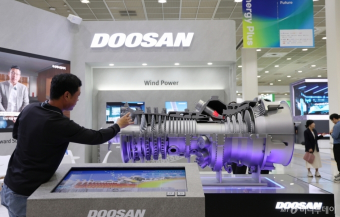 지난해 10월 15일 서울 강남구 코엑스에서 열린 '스마트에너지플러스 2025' 두산에너빌리티 부스의 수소 터빈 모형. /사진=이기범 기자 leekb@ |