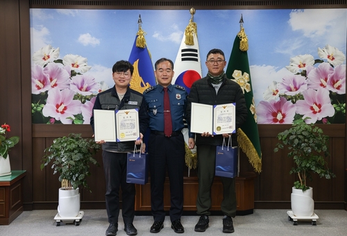 김종철 경남경찰청장(가운데)과 감사장 전달받는 배극찬(왼쪽)·김범수 씨 |