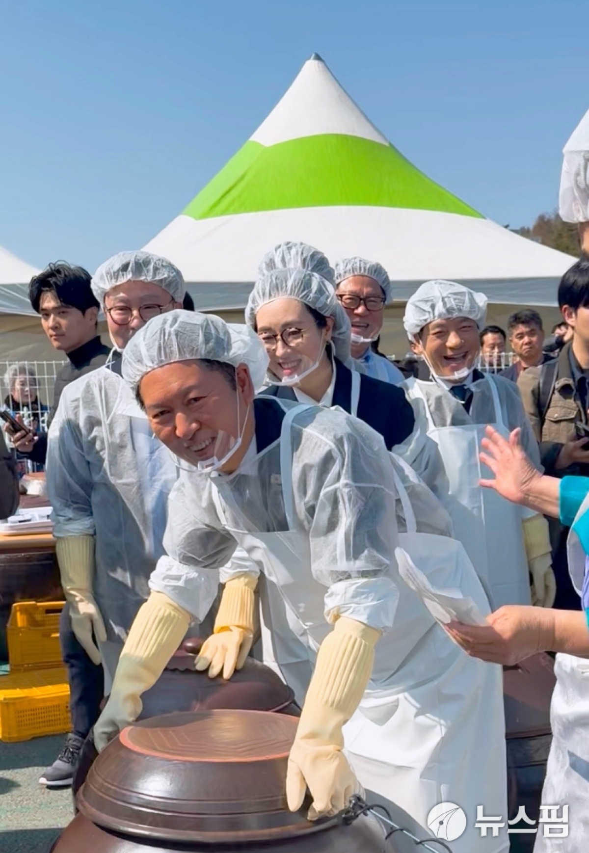 하얀색 위생 모자와 작업복을 갖춰 입은 정 대표와 민주당 최고위원들은 강순옥 명인의 설명을 들은 뒤 각자 배분된 장독에 메주 43개를 넣고 간수를 붓는 작업을 진행했다. 가장 먼저 작업을 마친 정 대표는 장독 뚜껑을 덮은 뒤 소금으로 '정' 자를 남기고 금줄을 둘렀다.