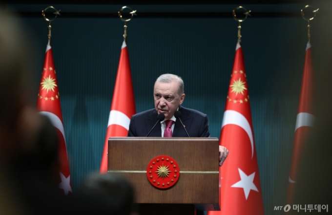 [앙카라=신화/뉴시스] 레제프 타이이프 에르도안 튀르키예 대통령이 9일(현지 시간) 튀르키예 앙카라에서 각료회의 후 기자회견하고 있다. 에르도안 대통령은 지역 긴장이 고조되는 가운데 “이란의 도발적인 행동은 형제 관계에 그림자를 드리우는 행위"라며 "이는 절대 용납되지 않을 일"이라고 경고했다. 2026.03.10. /사진=민경찬 |