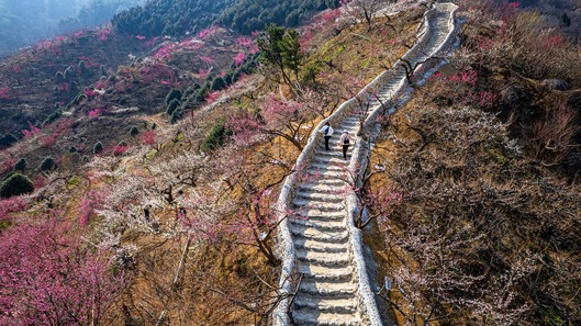올봄 전남 광양매화마을 '청매실농원'에 새롭게 조성한 '천국의 계단'. 농장주인 '매실 어매' 홍쌍리 매실 명인이 인부들과 손으로 하나하나 돌을 쌓아 만든 108개의 계단을 오르면 매화 천국과 섬진강, 하동까지 한눈에 다 담긴다. 올해 광양매화축제는 22일까지 일대에서 열린다. / 김종연 영상미디어 객원기자