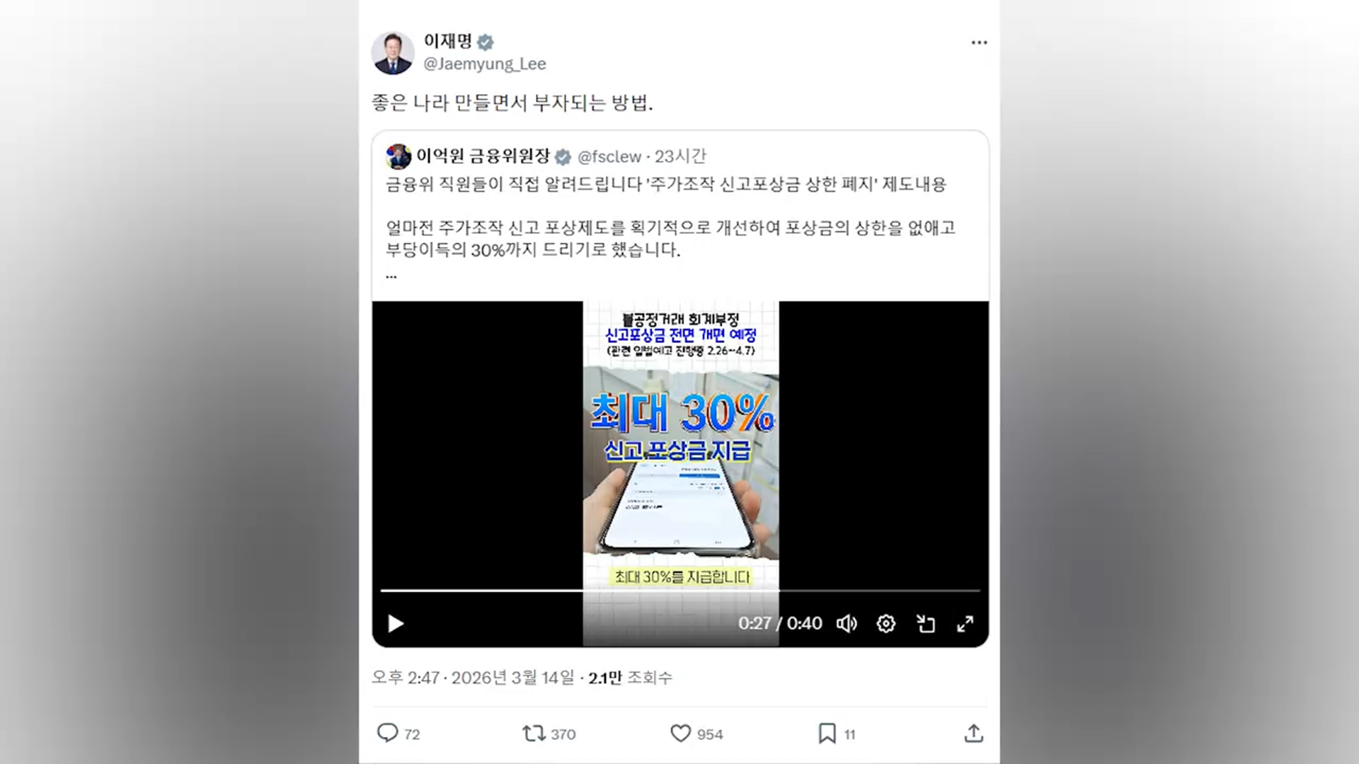 이 대통령은 오늘(14일) SNS에 최근 정부의 주가 조작 신고 포상금 상한선 폐지 정책을 소개한 동영상을 공유한 이억원 금융위원장의 글을 재게시하고서 이같이 적었습니다.