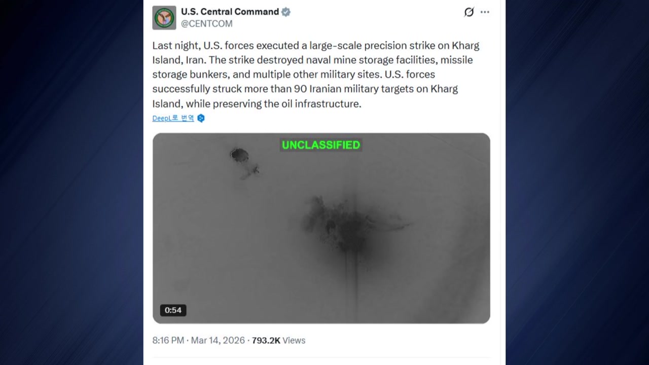 현지 시간 14일 대이란 군사작전을 수행 중인 미 중부사령부는 SNS를 통해 "전날 미군은 이란 하르그섬에 대한 대규모 정밀 타격을 수행했다"며 이같이 주장했습니다.