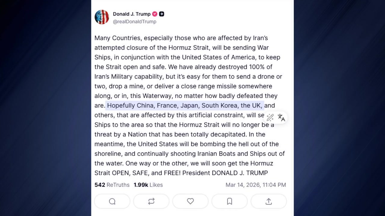 트럼프 대통령은 현지 시간 14일 자신의 SNS에 이란의 호르무즈 해협 봉쇄로 피해를 입고 있는 한국과 중국, 일본, 영국, 프랑스를 포함해 다른 국가들도 이 지역에 군함을 보내, 이란이 더 이상 위협하지 못하게 하기를 바란다고 적었습니다.