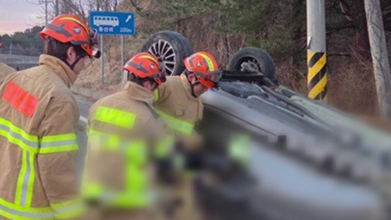 어제(14일) 새벽 5시 50분쯤 강원 양양군 현남면의 한 도로를 달리던 승용차가 도로 연석을 들이받고 전복됐습니다.