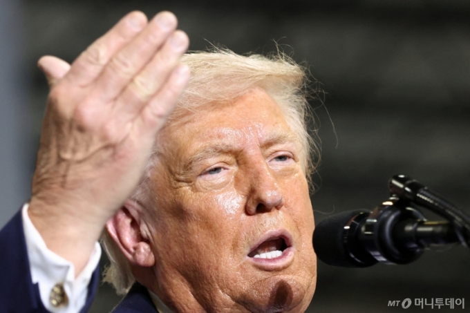 도널드 트럼프 미국 대통령이 지난 11일(현지시간) 켄터키주 헤브론에 위치한 버스트 로지스틱스를 방문해 연설하고 있다. /헤브론(미국) 로이터=뉴스1 |