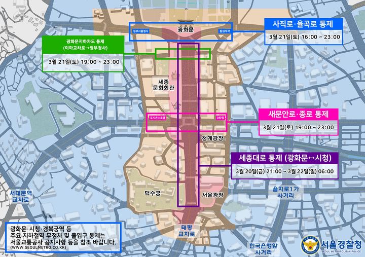 행사가 열리는 광화문 주변은 행사 당일 교통이 통제된다. 세종대로의 경우 광화문교차로에서 시청교차로 구간으로 20일 오후 9시부터 22일 오전 6시까지, 사직로와 율곡로는 적선교차로에서 동십자교차로 구간까지 행사 당일 오후 4시부터 오후 11시까지, 새문안로와 종로의 경우 포시즌스 호텔 앞에서 서린교차로 구간이 21일 오후 7시부터 오후 11시까지 통제된다.