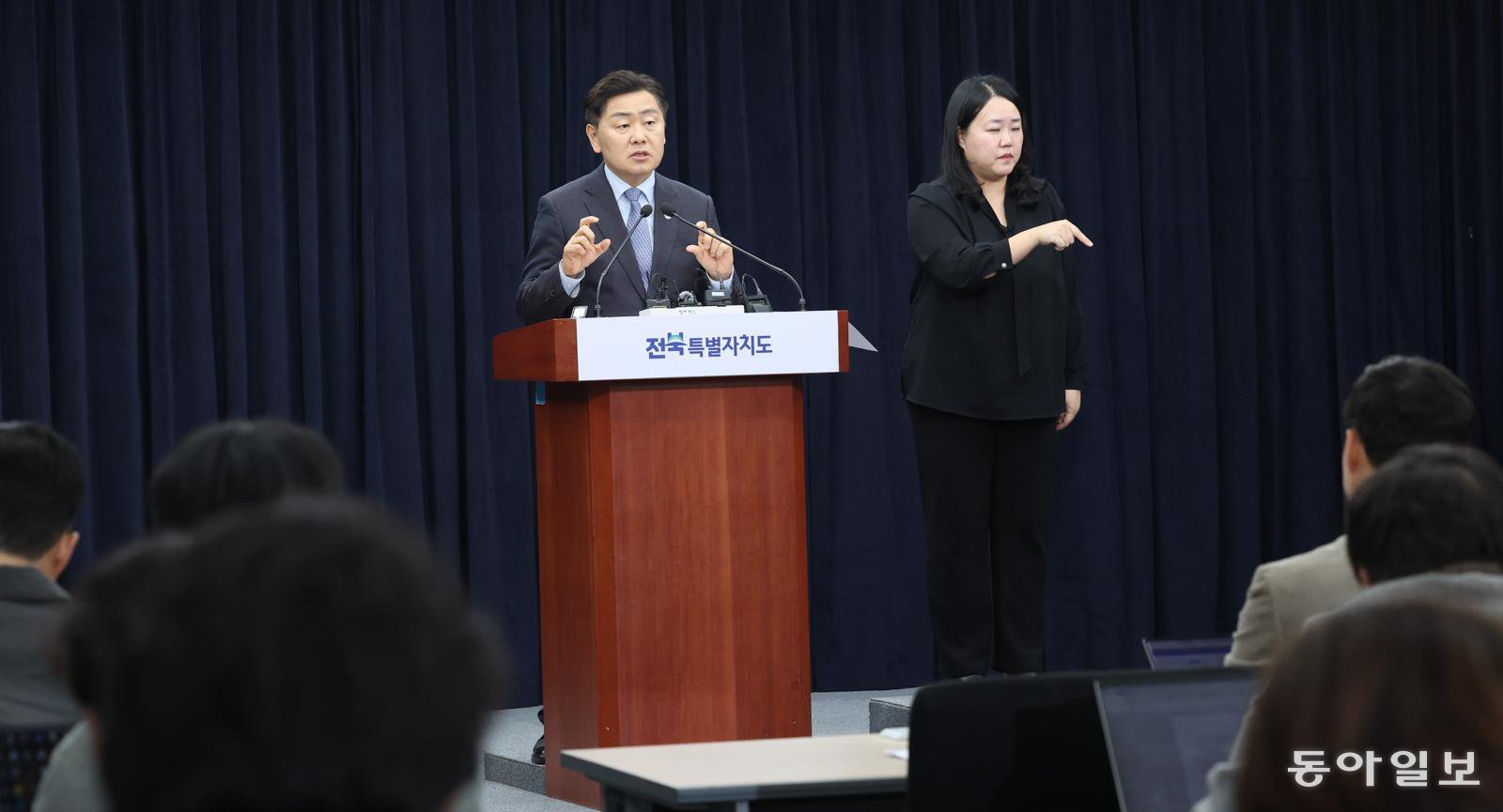 에코프라임마린퍼시픽과 HD현대중공업이 군산조선소 부지와 도크, 생산 설비 등을 넘겨받는 자산 양수도 합의각서(MOA)를 체결한 가운데 김관영 전북도지사가 13일 기자회견을 하고 있다. 전북도 제공 |