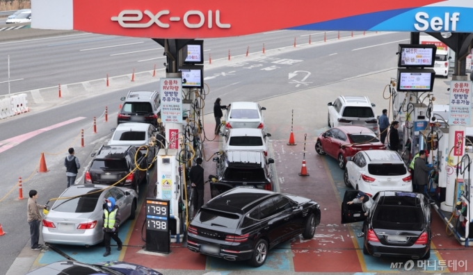 석유 최고가격제 시행 첫 주말을 맞은 15일 서울 서초구 만남의광장 주유소에서 시민들이 주유를 하고 있다. 유가정보시스템 오피넷에 따르면 이날 오전 10시25분 기준 전국 주유소 평균 휘발유 가격은 리터(ℓ)당 1842.1원으로 전날보다 3.2원 하락했다. 같은 시각 경유 가격은 1843.5원으로 4.5원 내렸다. /사진=뉴스1. |