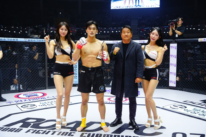 제주도MMA총협회 김종식 회장이 15일 서울 장충체육관에서 열린 굽네 ROAD FC 076 라이트급 매치에서 승리한 김산에게 트로피를 시상한 뒤 기념촬영을 하고 있다. 사진제공=로드FC