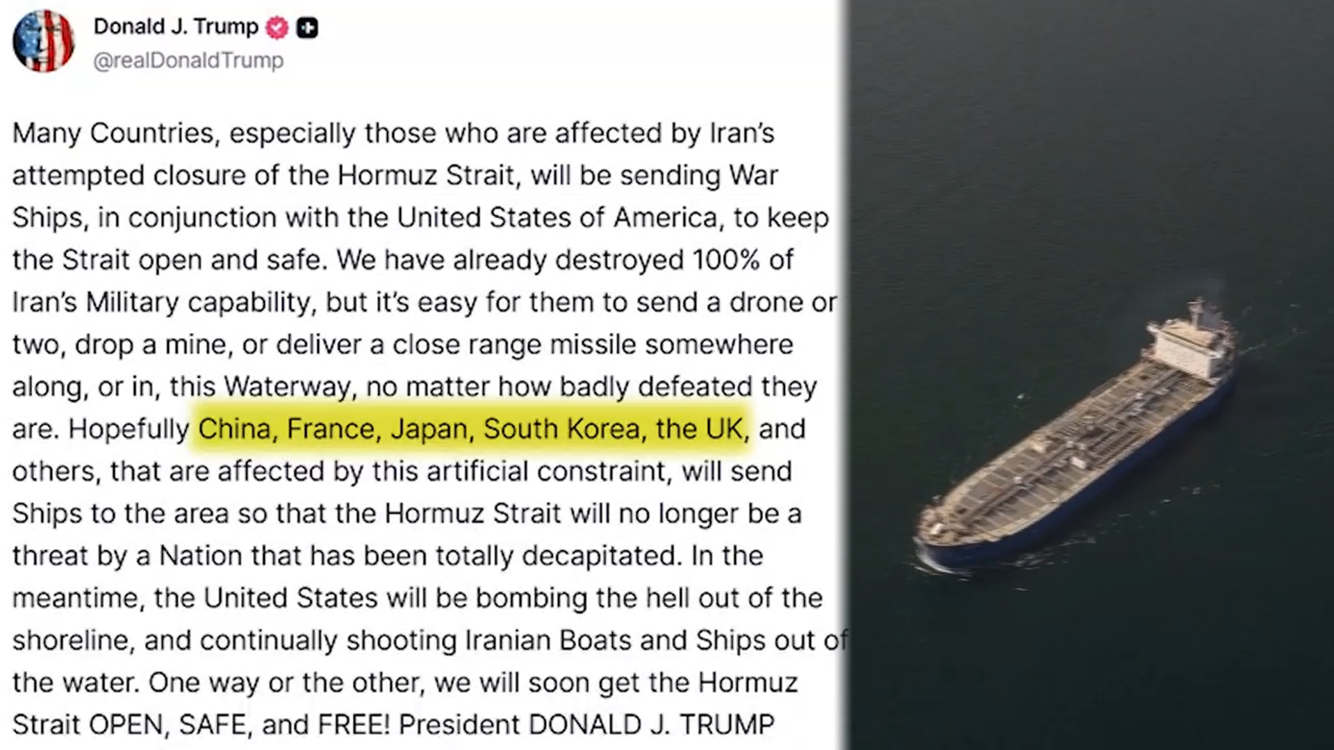 한국과 중국, 일본, 프랑스, 영국 등 5개국을 명시하며 "이 국가들이 함정을 보낼 것"이라고 적었습니다.