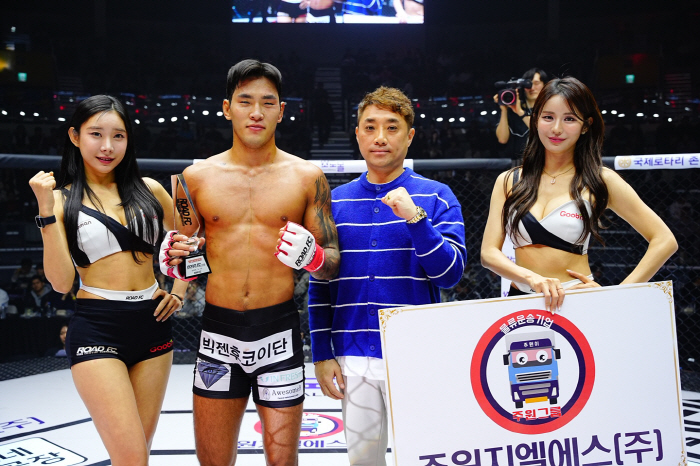 주원지엘에스 안종원 전무가 15일 서울 장충체육관에서 열린 굽네 ROAD FC 076 라이트급 매치에서 승리한 박시원에게 트로피를 시상한 뒤 기념촬영을 하고 있다. 사진제공=로드FC