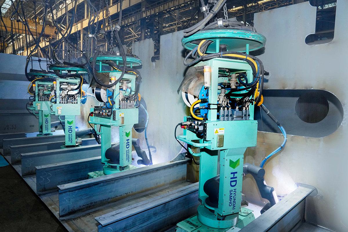 최근 찾은 전남 영암군 HD현대삼호 조선소의 패널 공장. 곳곳에서 철판 용접으로 인한 불꽃이 피어올랐다. 공정을 자세히 보려 철판 앞으로 향했지만 작업자는 없었다. 그 대신 자리를 채우고 있던 건 천장 구조물을 이용해 이동하는 로봇팔 6대. 이 로봇들이 팔 끝에 붙은 용접기로 쉴 새 없이 불꽃을 튀기며 대형 선박용 철판들을 하나로 이어 붙이고 있었다.