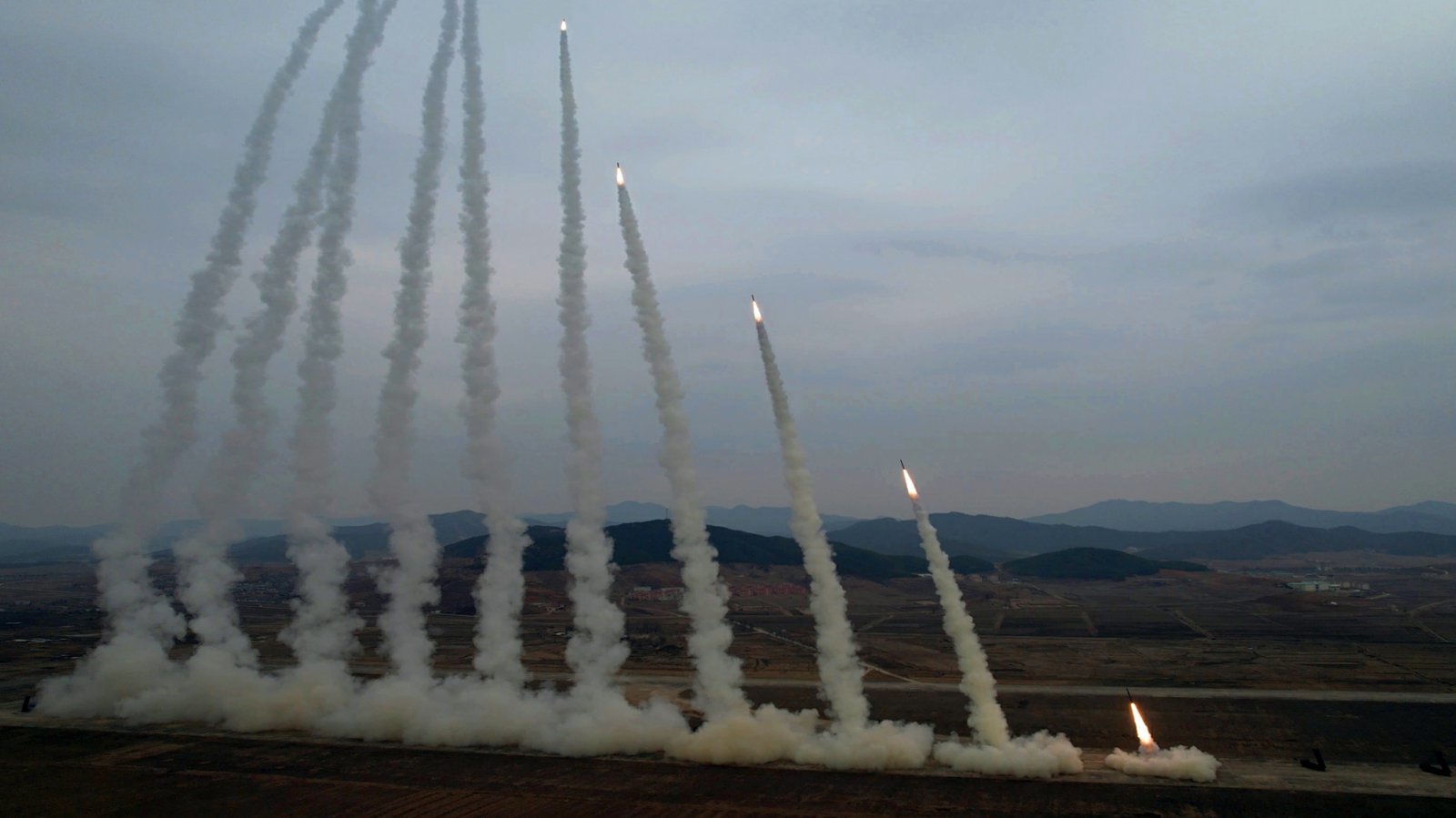 북한이 15일 공개한 사진에는 이동식발사차량(TEL) 12대가 나란히 줄지어 KN-25를 거의 동시다발적으로 쏴 올리는 모습이 담겨 있다. 조선중앙통신은 “방사포탄은 364.4km 계선의 조선 동해 섬 목표를 100%의 명중률로 강타하며 파괴력과 군사적 가치를 다시 한 번 증명했다”고 전했다. 앞서 우리 군은 전날(14일) 북한이 10여 발의 탄도미사일을 발사한 장소가 평양 순안 일대라고 발표한 바 있다.