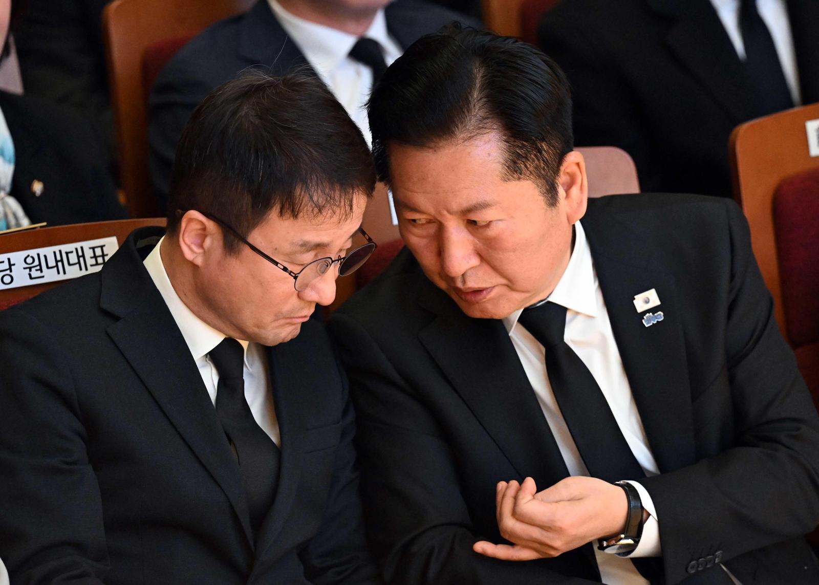 더불어민주당 정청래 대표(오른쪽)와 한병도 원내대표가 14일 서울 동작구 원불교 소태산기념관 대각전에서 열린 고 이해찬 전 국무총리 49재에서 대화를 나누고 있다. 청와대사진기자단 |