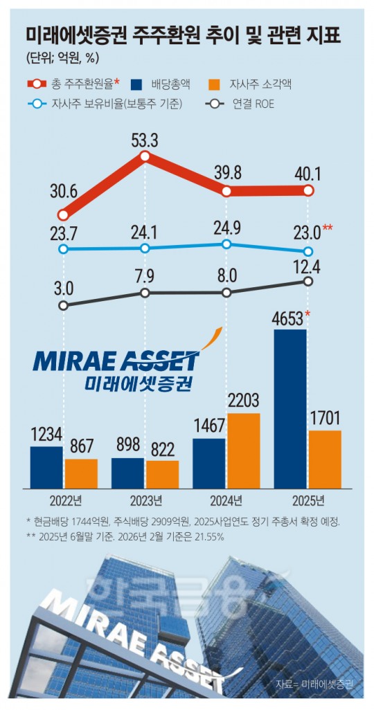 미래에셋증권이 지난 2024년 8월 공시한 ‘기업가치 제고(밸류업) 계획’에 따르면, 2026년 올해까지 단기 목표로 ‘ROE(자기자본이익률) 10% 이상, 주주환원성향 35% 이상’을 제시했다. 일단 2025년 연결 연환산 ROE는 12.4%로 기준을 충족했다. 배당과 자사주 소각을 더한 주주환원 성향 역시 목표를 초과했다.