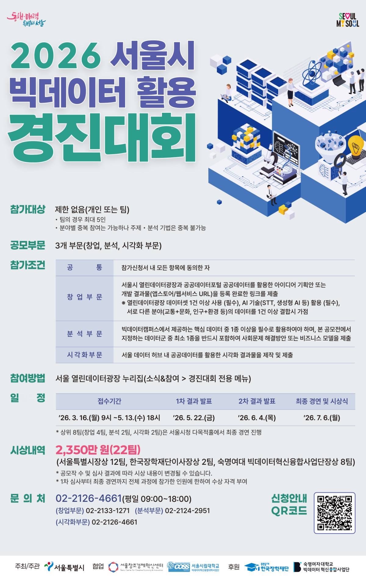 참가 접수는 3월 16일부터 5월 13일까지 열린데이터광장 누리집에서 진행된다. 서울시는 서류 심사와 전문가 평가를 거쳐 6월 초 22개 팀을 선정하고, 7월 6일 서울시청에서 열리는 본선 경연을 통해 최종 수상팀을 가릴 예정이다.