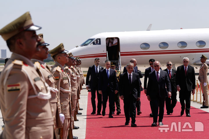[바그다드=AP/뉴시스] 바그다드 국제공항이 3월 15이 저녁 로켓포탄 5발의 공격을 당해 5명이 다쳤다. 사진은 이 공항에 도착한 제 34차 아랍연맹 정상회의 대표들을 2025년 5월 17일 이라크의 푸아드 후세인 외무장관( 오른쪽 앞)이 안내하고 있는 장면. 2026.03. 16. |