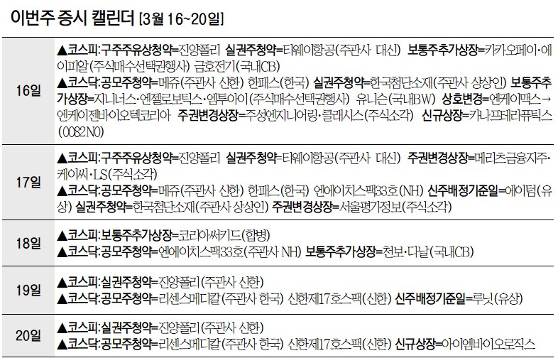 일반 투자자를 대상으로 한 공모주 청약도 이어진다. 해외송금 핀테크 기업 한패스와 이동형 원격 환자 모니터링 기업 메쥬는 16~17일 일반 청약을 진행한다. 한패스는 기관 수요예측에서 1172.59대 1의 경쟁률을 기록하며 공모가를 희망 밴드 상단인 1만 9000원으로 확정했다. 메쥬 역시 수요예측 흥행으로 공모가가 희망 밴드 상단인 2만 1600원으로 정해졌다.