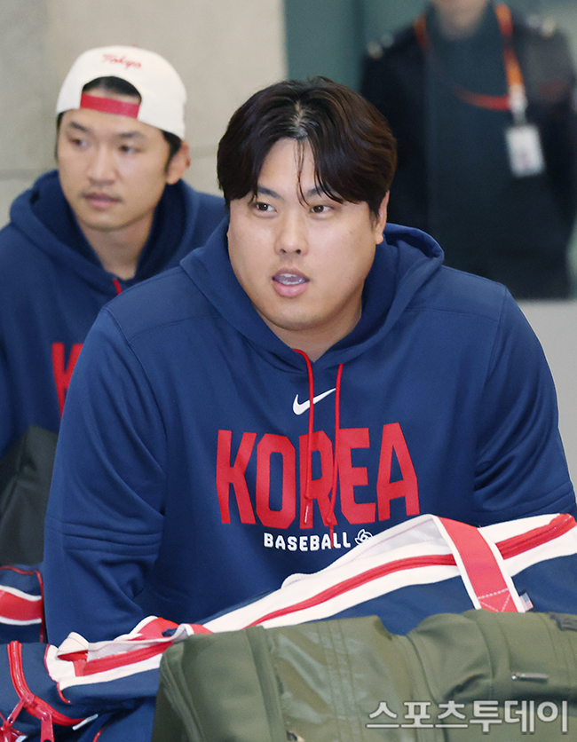 [인천공항=스포츠투데이 권광일 기자] 16일 오전 WBC 야구대표팀이 인천공항 제1터미널을 통해 귀국했다. 류현진이 선수단과 입국장을 나서고 있다. 2026.03.16.