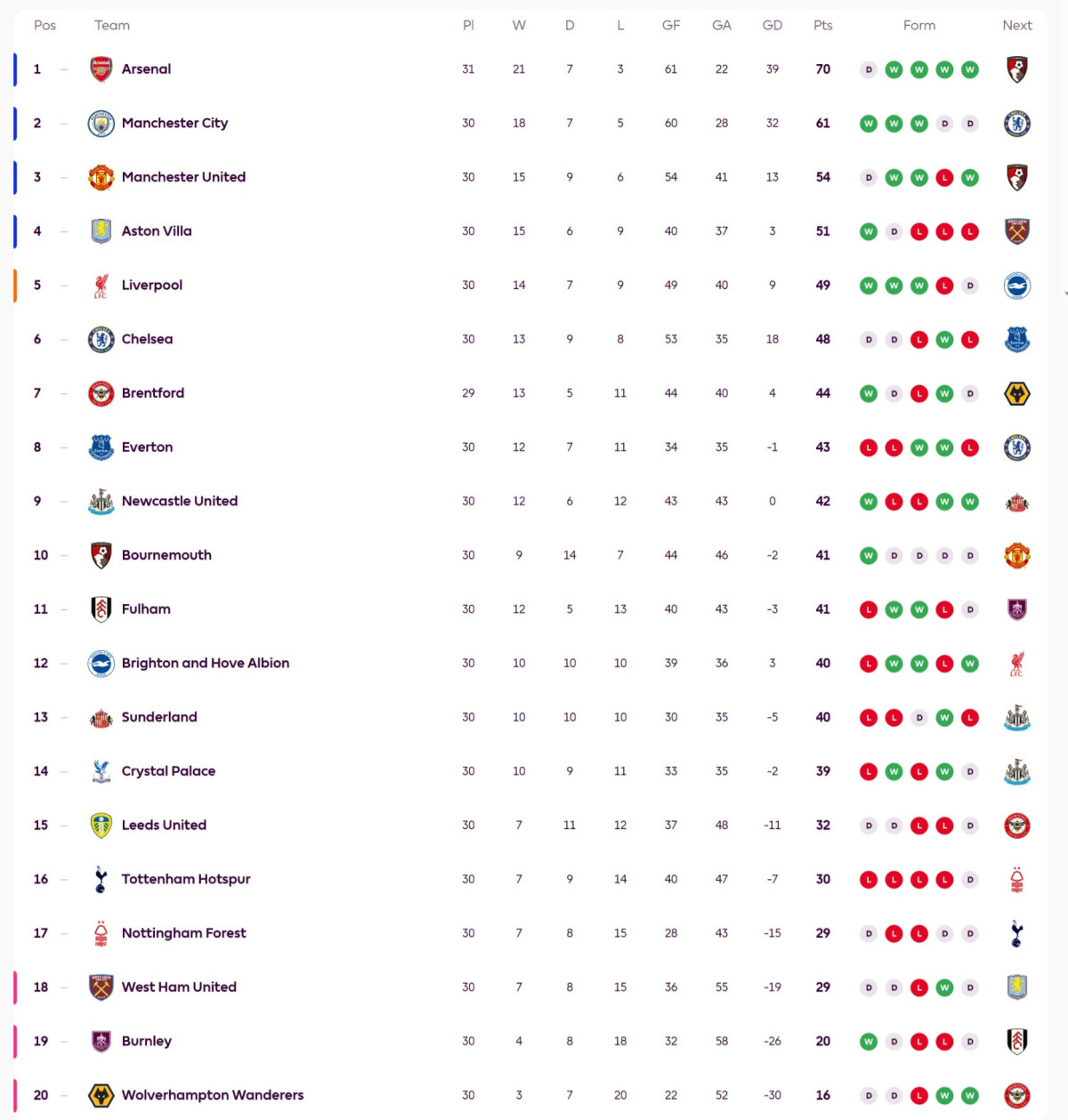 한편 같은 라운드에서 상위권 팀들의 경쟁도 이어졌다. 아스널은 에버턴을 2-0으로 꺾고 승점 70점으로 선두를 유지했고, 맨체스터 시티는 웨스트햄과 1-1로 비기며 승점 61점으로 2위에 자리했다. 맨체스터 유나이티드는 애스턴 빌라를 3-1로 제압하며 승점 54점으로 3위를 지켰다.