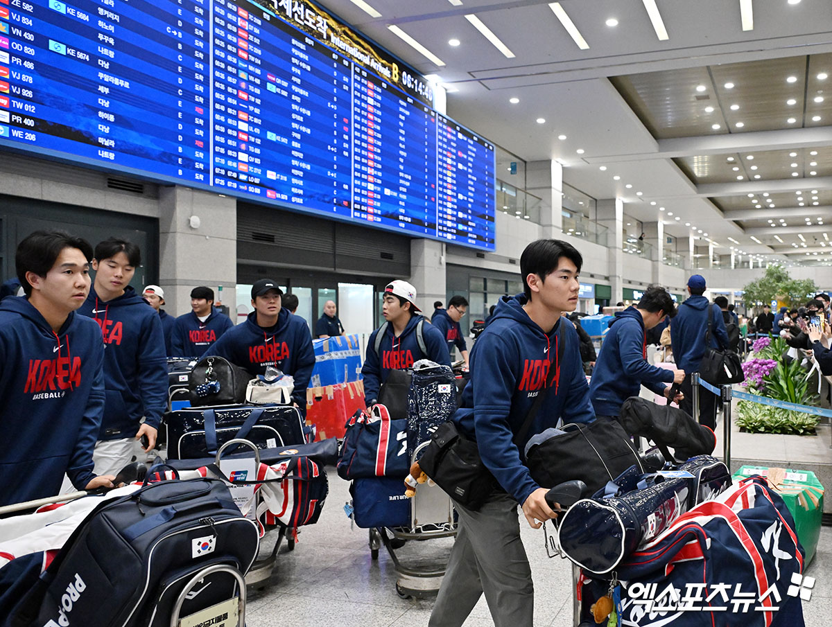 야구 대표팀 선수들이 입국장을 빠져나가고 있다.