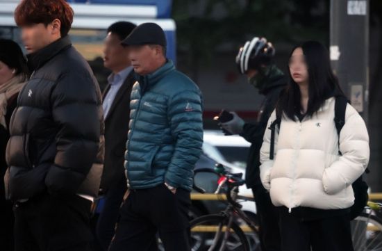 서울 마포구 공덕역 부근에서 출근길 시민들이 두툼한 패딩을 입고 발걸음을 옮기고 있다. 조용준 기자 |