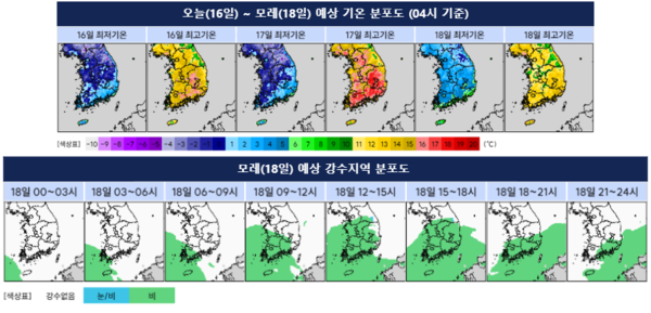 모레(18일)는 서해남부해상에서 동쪽으로 이동하는 저기압의 영향으로 새벽(00시~06시) 전남해안과 제주도부터 비가 시작된다. 오전(06시~12시)부터 오후(12시~18시) 사이에는 경기도 남부, 강원영서남부, 충청권, 남부지방, 제주도로 비구름대가 확대돼 비가 내릴 예정이다. 특히 강원남부 높은 산지(해발 1,000m 이상)는 비 또는 눈이 오겠고, 남부지방과 제주도에는 밤(18시~24시)까지 비가 이어질 것으로 보인다.