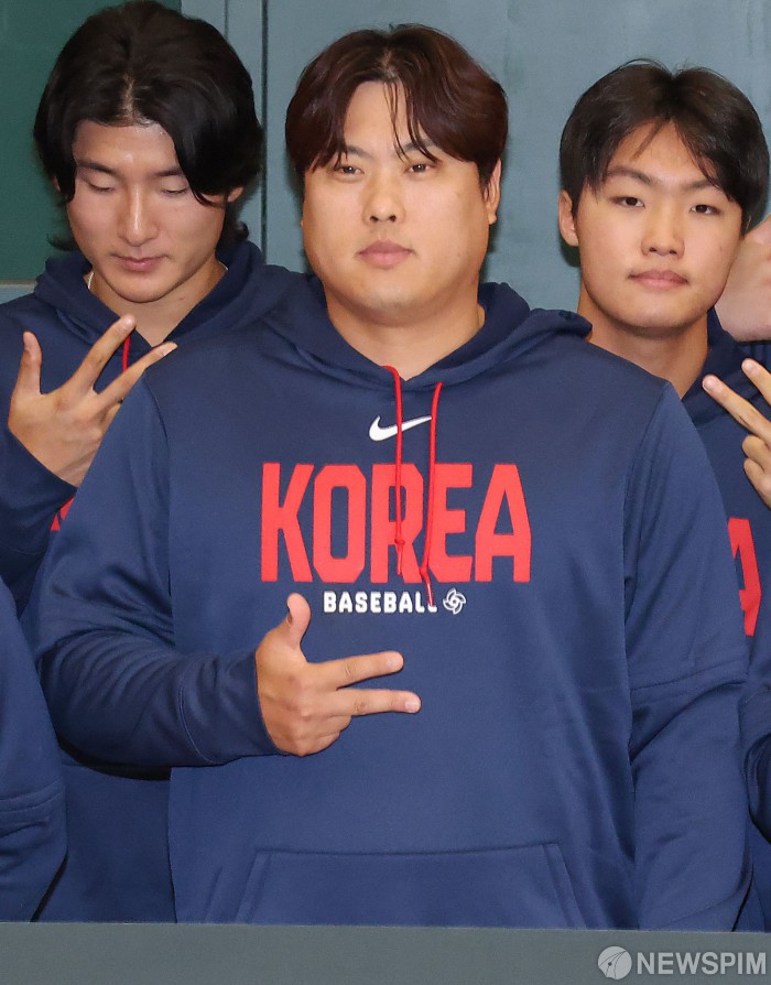 [영종도=뉴스핌] 류기찬 기자 = 2026 월드 베이스볼 클래식(WBC)에 출전했던 대한민국 야구 국가대표 류현진이 16일 오전 인천국제공항 제1여객터미널로 귀국해 기념촬영을 하고 있다. 2026.03.16 ryuchan0925@newspim.com