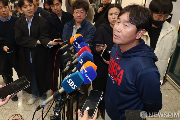 [영종도=뉴스핌] 류기찬 기자 = 류지현 대한민국 야구 국가대표팀 감독이 16일 오전 인천국제공항 제1여객터미널을 통해 귀국해 인터뷰를 하고 있다. 2026.03.16 ryuchan0925@newspim.com